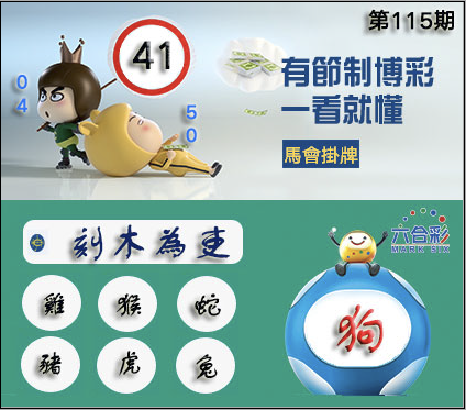 115期正版彩图挂:41 爆:狗 挂牌成语:刻木为吏 挂牌出肖:鸡猴蛇猪虎兔